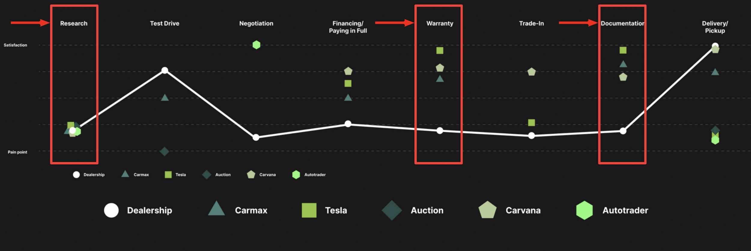 For example, in the Research Section of this map you can see that of our buyers had a negative experience during their car research process.